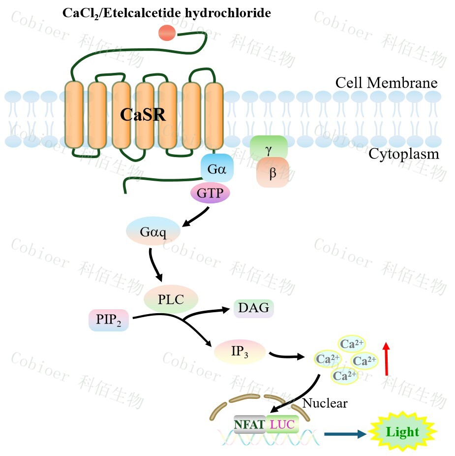 CaSR NFAT-Luc HEK293 細(xì)胞藥靶模型很好的模擬了體內(nèi) CaSR 的信號(hào)轉(zhuǎn)導(dǎo)過程,原 理見下圖所示。![]() Figure 1. CaSR NFAT-Luc HEK293 細(xì)胞模型原理圖 |