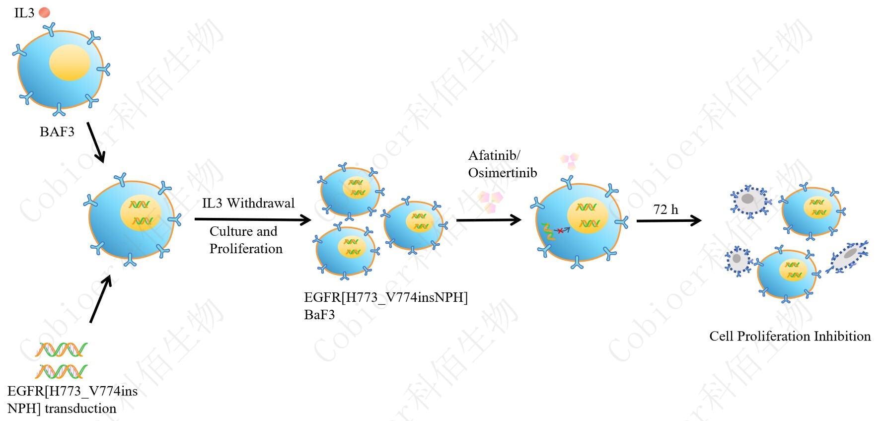 BaF3(小鼠原 B 細(xì)胞)的生長(zhǎng)和增殖需要 IL-3 的維持。通過(guò)引入各種表達(dá)激酶的基因, 能作為 BaF3 的驅(qū)動(dòng)基因,讓 BaF3 不再依賴 IL-3 而增殖,進(jìn)而激酶基因成為 BaF3 增殖依 賴的驅(qū)動(dòng)基因,用于評(píng)估小分子藥物對(duì)激酶的靶向抑制作用,原理及流程見(jiàn)下圖所示。![]() Figure 1. EGFR[H773_V774insNPH] BaF3 細(xì)胞的構(gòu)建原理圖 |